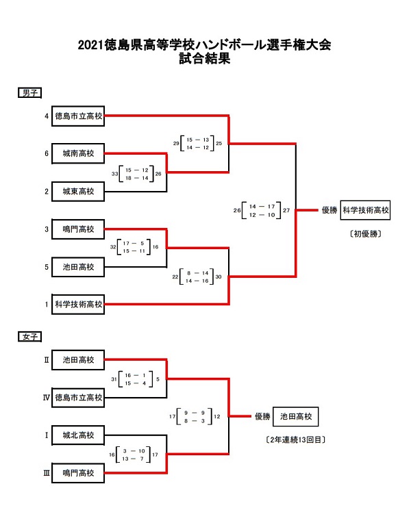 2021年4月25日 / 最終更新日時 : 2021年6月22日 middle 大会情報 令和3年度徳島県高等学校ハンドボール選手権大会結果 令和3年4月24日(土)25日(日)に鳴門アミノバリューホールにて開催されました高等学校選手権大会の結果です。 2021徳島県高等学校ハンドボール選手権大会(結果 トーナメント) 2021徳島県高等学校ハンドボール選手権大会(結果)