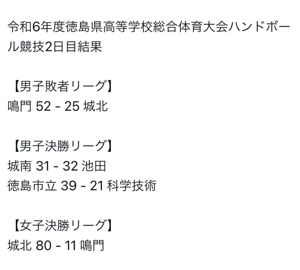 2024年6月1日 / 最終更新日時 : 2024年6月1日 middle 大会情報 令和6年度徳島県高等学校総合体育大会ハンドボール競技2日目結果 6月1日(土)の結果は以下のとおりです。 Screenshot