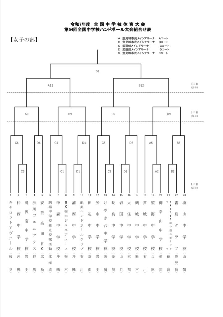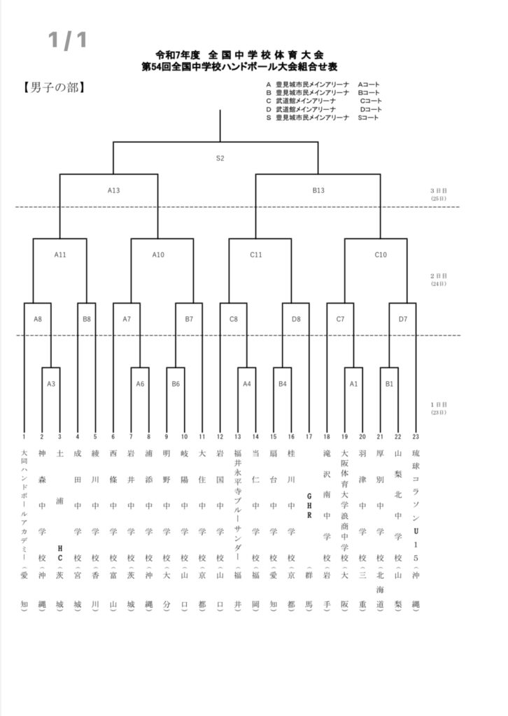 2025年8月23日(土)から25日(月)にかけて、沖縄県那覇市および豊見城市で開催される「第54回全国中学校ハンドボール大会(全中)」の組み合わせが決定しました。