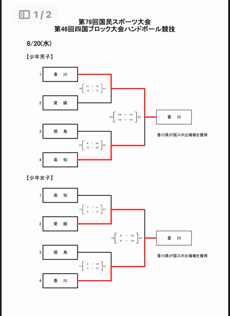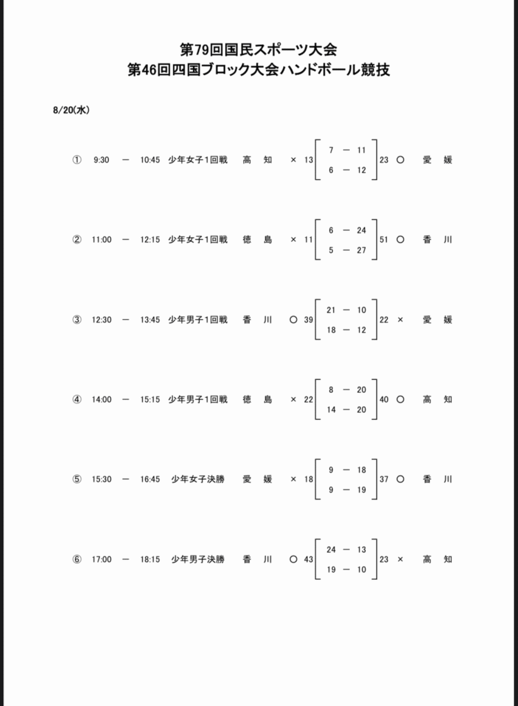 2025年8月21日 / 最終更新日時 : 2025年8月21日 middle ハンドボール協会 第79回国民スポーツ大会第46回四国ブロック予選(少年男女)試合結果 8月20日(水)、三好市池田総合体育館において開催されました、四国ブロック予選(少年男女)の結果は次のとおりです。 両種別ともに、香川県が国スポ大会への出場権を獲得しました。 2025国スポ四国ブロック予選結果(1日目)ダウンロード